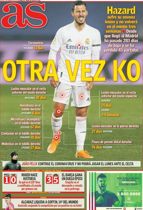 „Padł kolejny raz” – AS informuje, że Hazard doznał dziewiątej kontuzji i nie wróci do gry przynajmniej przez najbliższe trzy tygodnie. Od przejścia do Realu pozostawał poza dyspozycyjnością przez 283 dni i przegapił 43 mecze. Rozpiska od lewej górnej strony: koronawirus, listopad 2020, 13 dni pauzy; kontuzja prawego mięśnia prostego, listopad 2020, 30 dni; opuchlizna prawej kostki, listopad 2019, 8 dni; mikropęknięcie w prawej kostce, grudzień 2019, 67 dni; stłuczenie prawej kostki, czerwiec 2020, 10 dni; ból prawej kostki, wrzesień 2020, 27 dni; pęknięcie kości strzałkowej, luty 2020, 76 dni; kontuzja mięśniowa w prawej nodze, wrzesień 2020, 27 dni; kontuzja lewego mięśnia prostego, sierpień 2019 roku, 25 dni; teraz kontuzja lewego mięśnia prostego – przewidywana pauza 3-4 tygodnie.