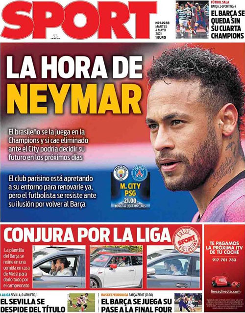 „Godzina Neymara” – Sport przekazuje, że Brazylijczyk gra o wszystko w Lidze Mistrzów i jeśli odpadnie dzisiaj z City, może rozstrzygnąć swoją przyszłość w najbliższych dniach. Paryski klub naciska na jego otoczenie, by już przedłużył kontrakt, ale piłkarz opiera się wobec swojej nadziei na powrót do Barcelony.