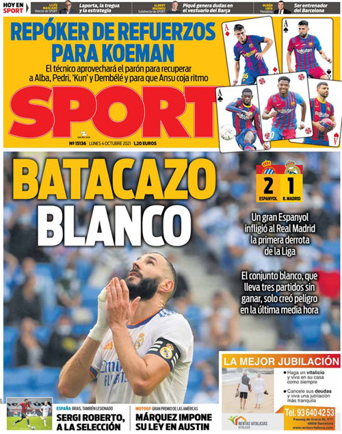 „Biały upadek” – Sport pisze o wielkim Espanyolu, który wymierzył Realowi Madryt pierwszą ligową porażkę. Królewscy, którzy mają serię trzech meczów bez wygranej, tworzyli zagrożenie tylko w ostatnich 30 minutach.