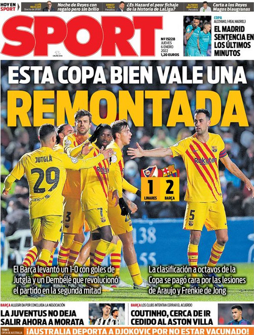 „Ten Puchar na pewno jest wart remontady” – Sport ogłasza, że Barcelona podniosła się z 0:1 po golach Jutgli i Dembélé, który odmienił mecz w drugiej połowie. Awans do 1/8 finału został drogo opłacony kontuzjami Araújo i Frenkie De Jonga.