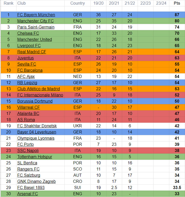 Ben Crellin, gracz i ekspert od Fantasy Premier League, który prezentuje swoje przemyślenia między innymi na Twitterze, stworzył ranking klubów na podstawie ich występów w europejskich pucharach od sezonu 19/20 (bo będzie on ostatnim, który będzie brany pod uwagę w 5-letniej klasyfikacji przed sezonem 2024/25; do rozegrania pozostają jeszcze końcówka obecnych rozgrywek oraz dwa kolejne lata); (w poniższej tabeli istnieje podział na najważniejsze ligi):