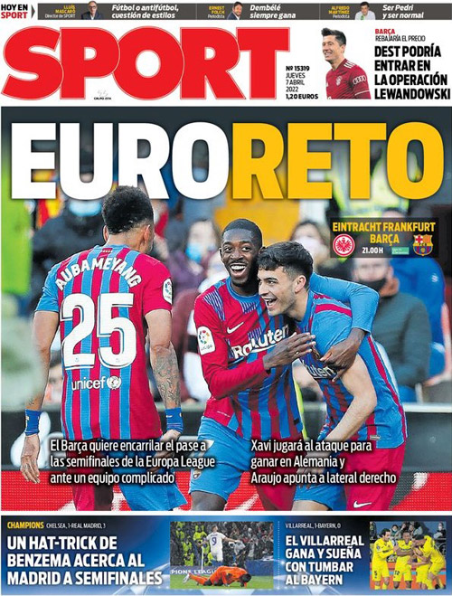 „Niech utrzyma się seria” – Mundo Deportivo analizuje, że Barcelona ma nadzieję na utrzymanie dobrego momentu i zrobienie pierwszego kroku w kierunku półfinałów. Xavi ma wystawić podstawową jedenastkę, a Aubameyang poszuka swojego 25. gola w Lidze Europy.