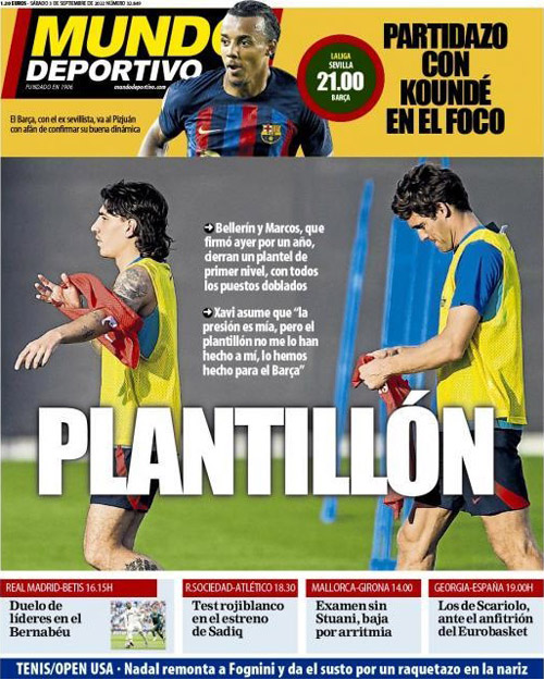 „Egzamin dla nowej Barçy” – Sport przekazuje, że Sevilla, która ciągle nie wygrała żadnego meczu, wystawia na próbę dobre odczucia Blaugrany. Xavi wykazuje zadowolenie po zamknięciu rynku transferowego, ale stwierdza, że „zabrakło pewnego piłkarza”.