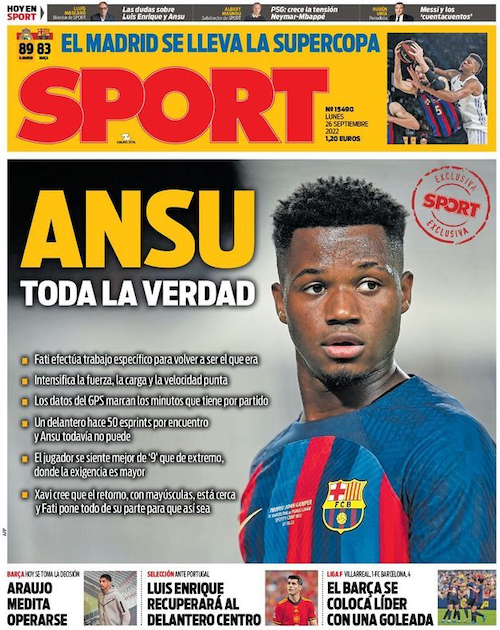 Superpuchar Hiszpanii w koszykówkę oraz plany Barcelony i Ansu Fatiego to główne tematy na poniedziałkowych okładkach najpopularniejszych dzienników sportowych w Hiszpanii.