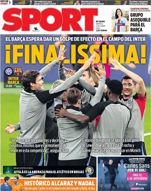 „Finalissima!” – Sport analizuje, że Barcelona ma nadzieję na zadanie krytycznego ciosu na boisku Interu. „Musimy być odważni i powiedzieć samym sobie, że to moment, by pokazać się w tych rozgrywkach z odpowiedniej strony”, zapewnia Xavi. Katalończycy chwytają się goli Lewandowskiego, który ma dobrą serię i chce zrekompensować sobie brak trafienia w Monachium.