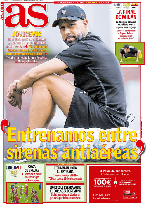 „Trenujemy między syrenami przeciwlotniczymi” – AS zapowiada wywiad z Jovićeviciem, który grał przez 5 lat w Castilli i jutro poprowadzi Szachtar na Bernabéu. Wypowiedzi z okładki: „Drużyna jest zaangażowana w politykę, w pomoc swojemu ludowi”; „Nikt nie zrobił tego, co zrobił Modrić; nawet Xavi ani Iniesta”.