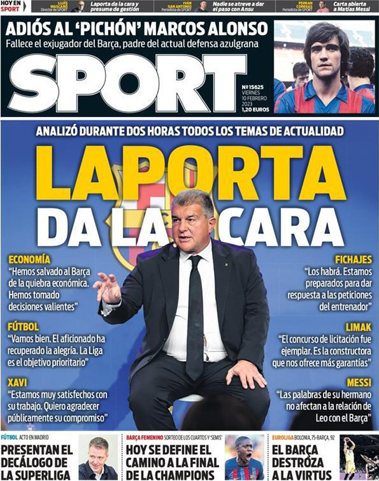 „Laporta wychodzi z wyjaśnieniami” – Sport wskazuje, że prezes Barcelony przez dwie godziny analizował bieżące tematy. Ekonomia: „Uratowaliśmy Barcelonę przed finansowym bankructwem. Podjęliśmy odważne decyzje”. Futbol: „Idzie nam dobrze. Kibic odzyskał radość. La Liga to priorytetowy cel”. Xavi: „Jesteśmy bardzo zadowoleni z jego pracy. Chcę podziękować mu publicznie za jego zaangażowanie”. Transfery: „Będą. Jesteśmy przygotowani, by odpowiedzieć na prośby trenera”. Limak: „Przetarg na przebudowę był wzorowy. To firma, która oferuje nam największe gwarancje”. Messi: „Słowa jego brata nie wpływają na stosunki Leo z Barceloną”.
