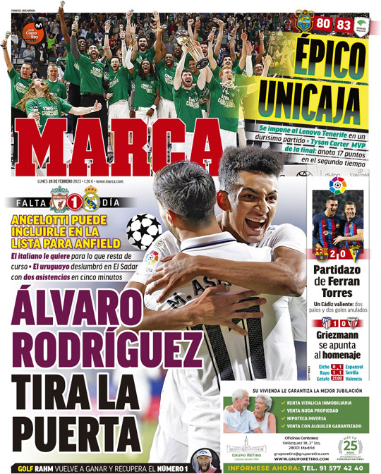 „Álvaro Rodríguez wyważa drzwi” – MARCA na dzień przed meczem z Liverpoolem informuje, że Ancelotti może włączyć go do kadry na Anfield. Włoch chce go w zespole na resztę sezonu. Urugwajczyk błysnął na El Sadar z dwoma asystami w ciągu pięciu minut.