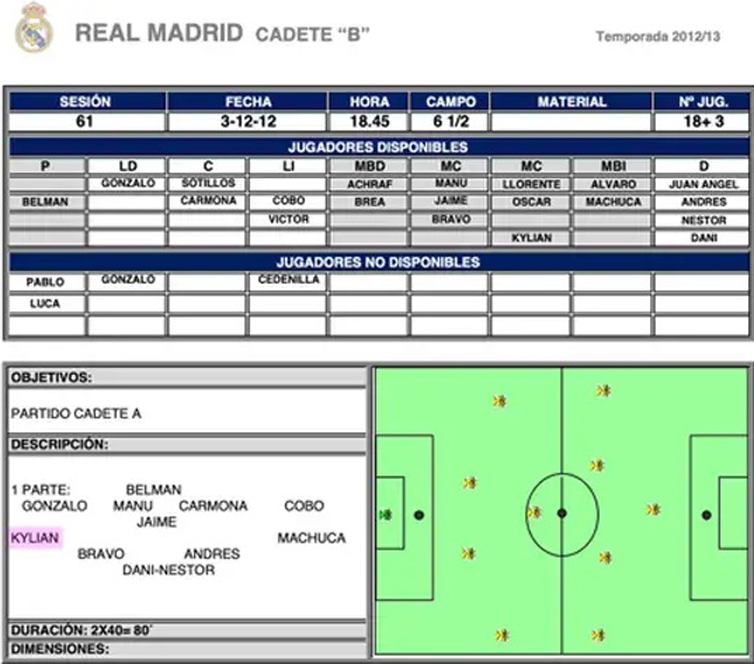 Trenerzy Cadete A i Cadete B, czyli Santiago Sánchez i Rubén de la Red, otrzymali polecenie zorganizowania 80-minutowego wewnętrznego meczu (dwie połowy po 40 minut), by obejrzeć Francuza z większą dokładnością. W pierwszej połowie Kylian zagrał jako prawoskrzydłowy, a w drugiej jako mediapunta. Na obu pozycjach zaznaczył swoją obecność. De la Red wspomina o jego szybkości: „Robił różnicę przy wolnej przestrzeni. Był chudziutki, malutki, nawet jak na swoje 14 lat. Patrzyliśmy po sobie, gdy zmieniał rytm biegu”.
