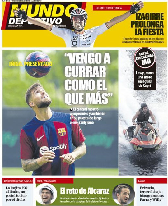 „Przychodzę harować jak ten, który robi to najciężej” – Mundo Deportivo podaje, że Iñigo Martínez został zaprezentowany. Stoper wykazał się zaangażowaniem i ambicją przy pokazaniu się jako piłkarz Barcelony. Na boku zdjęcia na wyłączność dziennika: Lewy jak motorek na wodach Capri.
