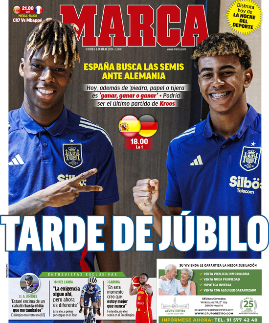 Poza tym na dole wywiady: „Będę na koniu do dnia, w którym się zachwieję” – wywiad z najstarszym hiszpańskim olimpijczykiem, 65-letnim Juanem Antonio Jiménezem Cobo; „Dalej mam wymagania, ale teraz jest inaczej” – w tym roku kolarz Mikel Landa walczy o etapowe wygrane w Tourze; „W tym momencie uważam, że jestem w najlepszej formie, w jakiej kiedykolwiek byłem” – wywiad z koszykarzem Garubą – Finlandia rywalem Hiszpanii w turnieju przedolimpijskim.