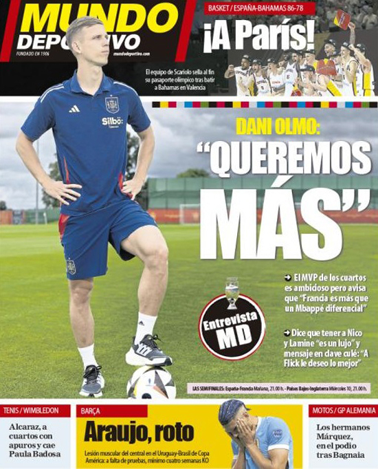 „Chcemy więcej” – Mundo Deportivo zapowiada wywiad z Danim Olmo. MVP ćwierćfinałów jest ambitny, ale ostrzega, że „Francja to więcej niż robiący różnicę Mbappé”. Mówi, że posiadanie Nico i Lamine'a to „luksus” i ma przesłanie w kontekście Barcelony: „Flickowi życzę wszystkiego najlepszego”. Terminarz półfinałów EURO.