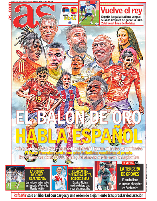 Mistrz Europy chce więcej. La Roja, z możliwością gry Lamine'a Yamala, rozpoczyna walkę w Lidze Narodów przeciwko Serbii w piekle Belgradu. Złota Piłka z hiszpańskim smakiem: 11 nominacji z Hiszpanii do nagród męskich. Bonmatí ponownie faworytką. Rafa Mir zwolniony za kaucją. Marc Soler: „Jestem jednym z tych, którzy naciskają na lidera”.