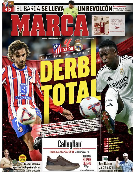 „Derby totalne” – MARCA wskazuje, że triumf będzie mieć podwójną wartość: wyprowadzenie mocnego ciosu i przybliżenie się do pozycji lidera. Griezmann to koszmar Królewskich: trzy gole w ostatnich czterech pojedynkach. Vinícius podchodzi do ogromnego wyzwania, a Bellingham wraca na pozycję, która go wyniosła na szczyt.