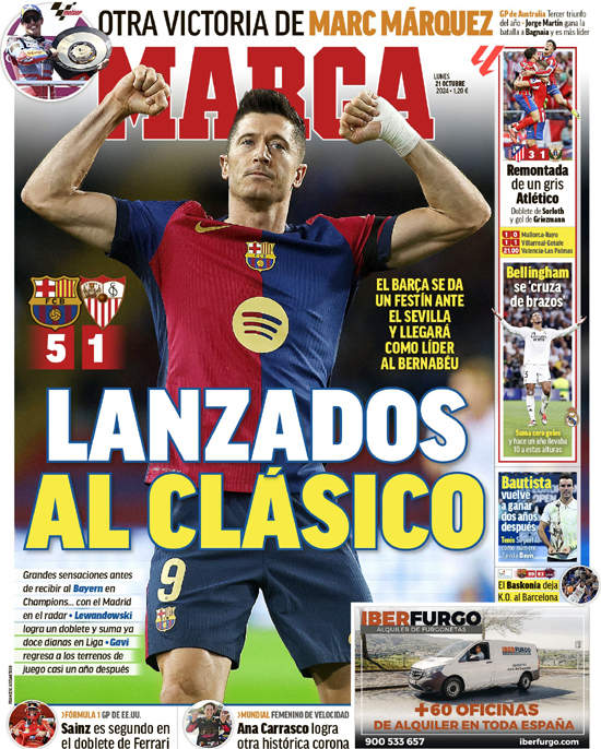 „Odpaleni na Klasyk” – MARCA wskazuje, że Barcelona zorganizowała sobie festyn w meczu z Sevillą i przyjedzie na Bernabéu jako lider. Wielkie odczucia przed przyjęciem Bayernu w Lidze Mistrzów... i z Realem na radarze. Lewandowski zbiera dublet i ma już 12 trafień w La Lidze. Gavi wraca na boisku po prawie roku przerwy.