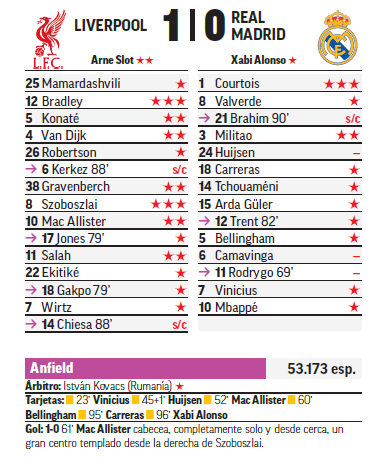 Fatalny w rozegraniu, gdzie albo notował niewymuszone straty, albo szukał bardzo trudnych rozwiązań. W obronie dużo słabszy fizycznie od rywali. To on dosłownie podał do Wirtza w sytuacji, w której Szoboszlai stanął sam na sam przed Courtois. Jego obecność w jedenastce w aspekcie defensywnym zaczyna być wyraźnym problemem.