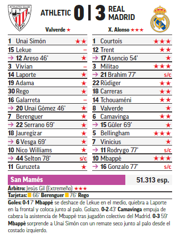 Co tu dużo mówić, fruwa nad rywalami i ofensywnie to bez wątpienia jego drużyna. Dwa gole i asysta, w tym kolejny udział głową. Tym razem warto wskazać, że dokładnie rok temu (chodzi o dzień dzisiejszy) 4 grudnia też grał na San Mamés i nie wykorzystał karnego. Potem sam przyznał, że to był jego najgorszy moment w Realu. A dzisiaj? Uff.