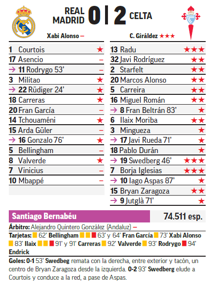 Być może najlepszy piłkarz w ataku w pierwszej połowie, kiedy stworzył sobie sytuację indywidualną akcją, dorzucił celnie z rożnego na głowę Bellinghama czy zmarnował świetną akcję Viniego i Kyliana. W drugiej już niewidoczny i zdjęty jako pierwszy w ramach reakcji na gola Celty.