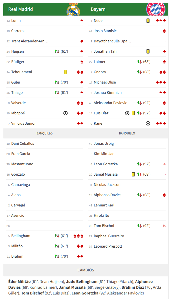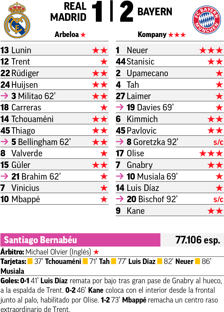 Wystawienie Thiago od pierwszej minuty okazało się błędem, zwłaszcza że po wejściu Bellinghama środek pola wyglądał znacznie lepiej. Real przez długie fragmenty grał zbyt głęboko, oddał Bayernowi kontrolę i długo nie potrafił wyjść spod pressingu, za co spora odpowiedzialność spada na Arbeloę. Królewscy i tak stworzyli sobie kilka bardzo dobrych sytuacji, jednak przez większą część spotkania trudno było dostrzec wyraźny plan na ten mecz.