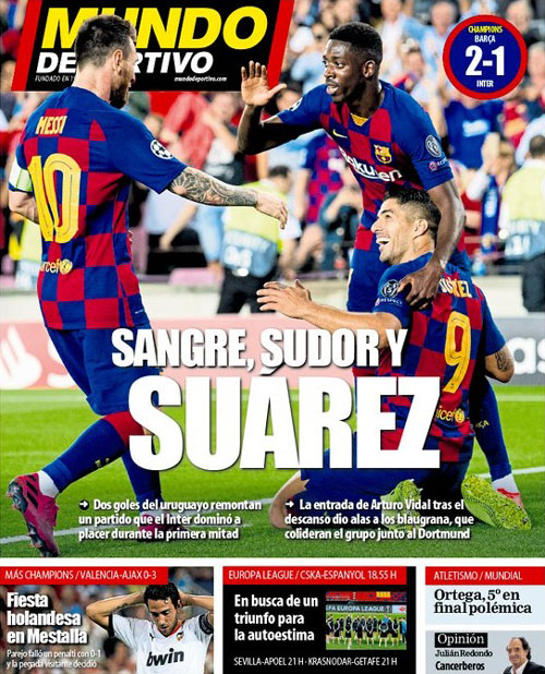 „Krew, pot i Suárez” – Mundo Deportivo przekazuje, że dwa gole Urugwjaczyka pozwoliły odwrócić wynik meczu, w którym Inter zdominował z łatwością pierwszą połowę. Wejście Arturo Vidala po przerwie dodało skrzydeł Katalończykom, którzy prowadzą w grupie razem z Dortmundem.