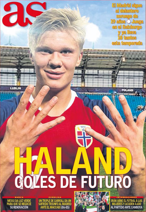 „Håland - gole przyszłości” – AS informuje, że Real obserwuje 19-letniego norweskiego napastnika. Gra w Salzburgu i ma już na koncie 18 trafień w tym sezonie.