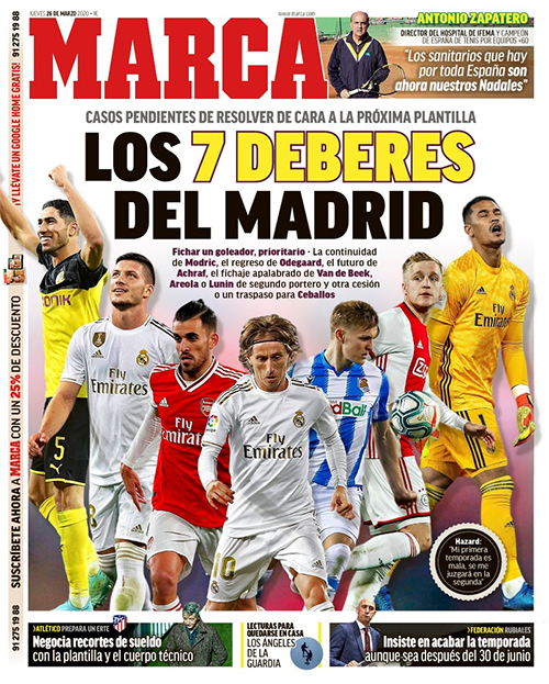 „7 prac domowych Realu” – sprawy oczekujące na rozstrzygnięcie przy tworzeniu nowej kadry. Priorytetem jest transfer goleadora, a później ewentualne pozostanie Modricia, powrót Ødegaarda, przyszłość Achrafa, zaklepany transfer Van de Beeka, pozycja drugiego bramkarza dla Areoli lub Łunina i kolejne wypożyczenie albo sprzedaż Ceballosa. Hazard przyznaje, że jego pierwszy sezon w Realu jest słaby, ale będzie sądzony w drugim.