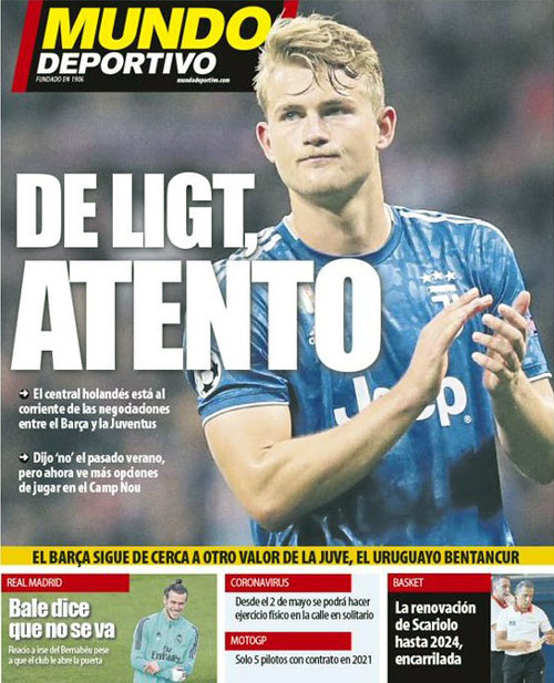 „Uważny De Ligt” – Mundo Deportivo podaje, że holenderski stoper jest na biężąco z negocjacjami między Barceloną a Juventusem. Powiedział „nie” ostatniego lata, ale teraz widzi więcej szans na grę na Camp Nou. Do tego na żółtym pasku: Barcelona obserwuje blisko także inną mocną część Juve, Urugwajczyka Bentancura.