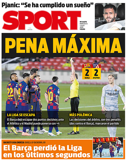 „Maksymalna kara” – gazeta stosuje w tytule grę słów, ponieważ zwrot pena máxima to również synonim „rzutu karnego”. Mistrzostwo oddala się od Barcelony po remisie naznaczonym przez samobója, trzy jedenastki i nową polemikę dotyczącą sędziowania. VAR nakazał powtórzenie rzutu karnego, który obronił Ter Stegen, ale nie przejrzał akcji z udziałem Piqué w polu karnym Atlético. 700. gol Messiego à la Panenka.