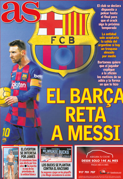 „Barcelona rzuca wyzwanie Messiemu” – AS twierdzi, że klub zadeklarował gotowość do walki do końca, by crack pozostał na kolejny sezon. Barcelona zaakceptuje odejście Argentyńczyka jedynie w przypadku wysokiego transferu. Bartomeu chce, by zawodnik wytłumaczył kibicom powody swojego pożegnania i sposób, w jaki do niego doszło.