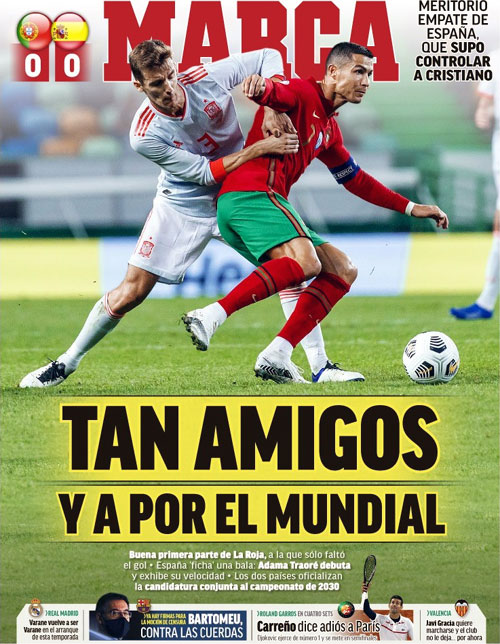 „Po przyjacielsku i razem po mundial” – MARCA pisze o zasłużonym remisie Hiszpanii, która potrafiła kontrolować Cristiano. Dobra pierwsza połowa La Rojy, której zabrakło tylko gola. Hiszpania „pozyskała” pocisk: Adama Traoré debiutuje i popisuje się szybkością. Oba kraje przy okazji meczu oficjalnie ogłosiły wspólną kandydaturę w sprawie organizacji mistrzostw świata w 2030 roku.