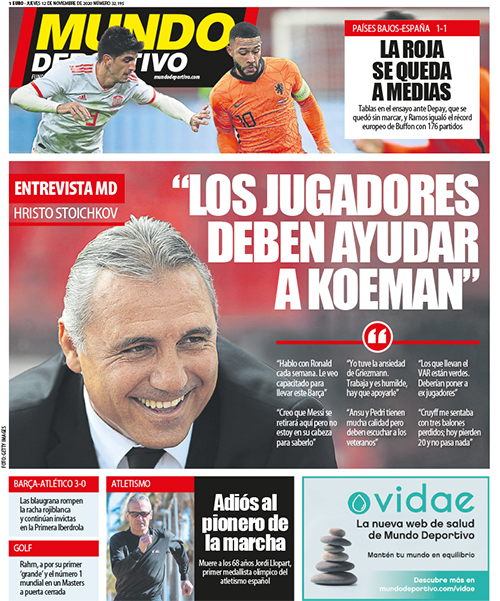 „Piłkarze powinni wspierać Koemana” – Christo Stoiczkow udzielił wywiadu na wyłączność gazecie. „Rozmawiam z Ronaldem co tydzień. Widzę, że ma predyspozycje, aby prowadzić tę Barcelonę”; „Miałem ten niepokój co Girezmann. Pracuje i jest pokorny, trzeba go wspierać”; „Ci, którzy zajmują się VAR, są zieloni. Trzeba tam dać byłych piłkarzy”; „Myślę, że Messi zakończy tu karierę, ale nie siedzę w jego głowie, żeby to wiedzieć”; „Ansu i Pedri mają wiele jakości, ale muszą słuchać się starszych”; „Cruyff sadzał mnie po trzech straconych piłkach, teraz tracisz dwadzieścia i nic się nie dzieje”.